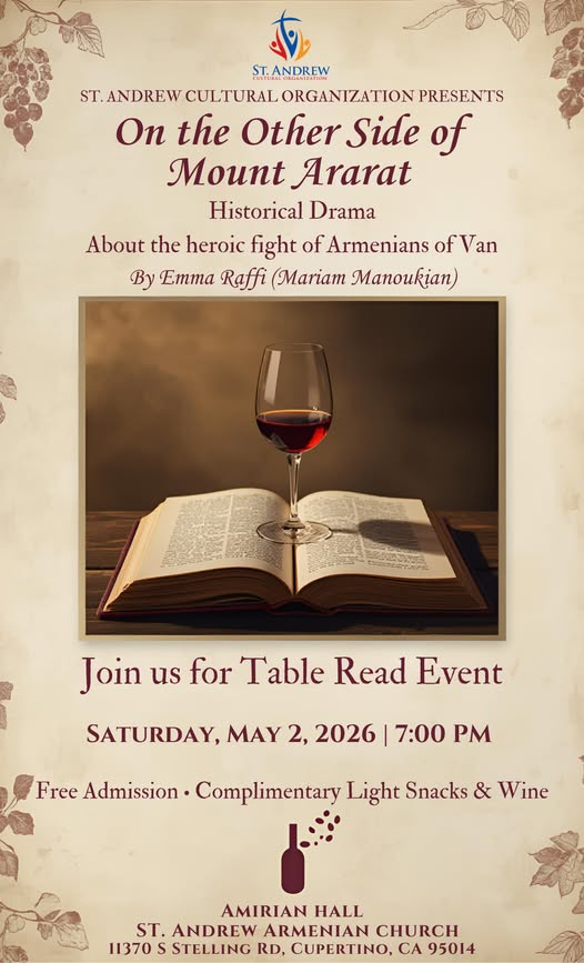 The Cultural Organization of the St Andrew Armenian Church invites you to a special table read of the play “On the Other Side of Mount Ararat,” written by Mariam Manoukian (Emma Raffi). This powerful work is dedicated to the heroic defense of the people of Van in 1915.